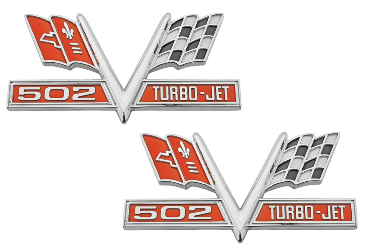 Front fender cross flag emblems with 502 Turbo-Jet designation. Sold as a pair.