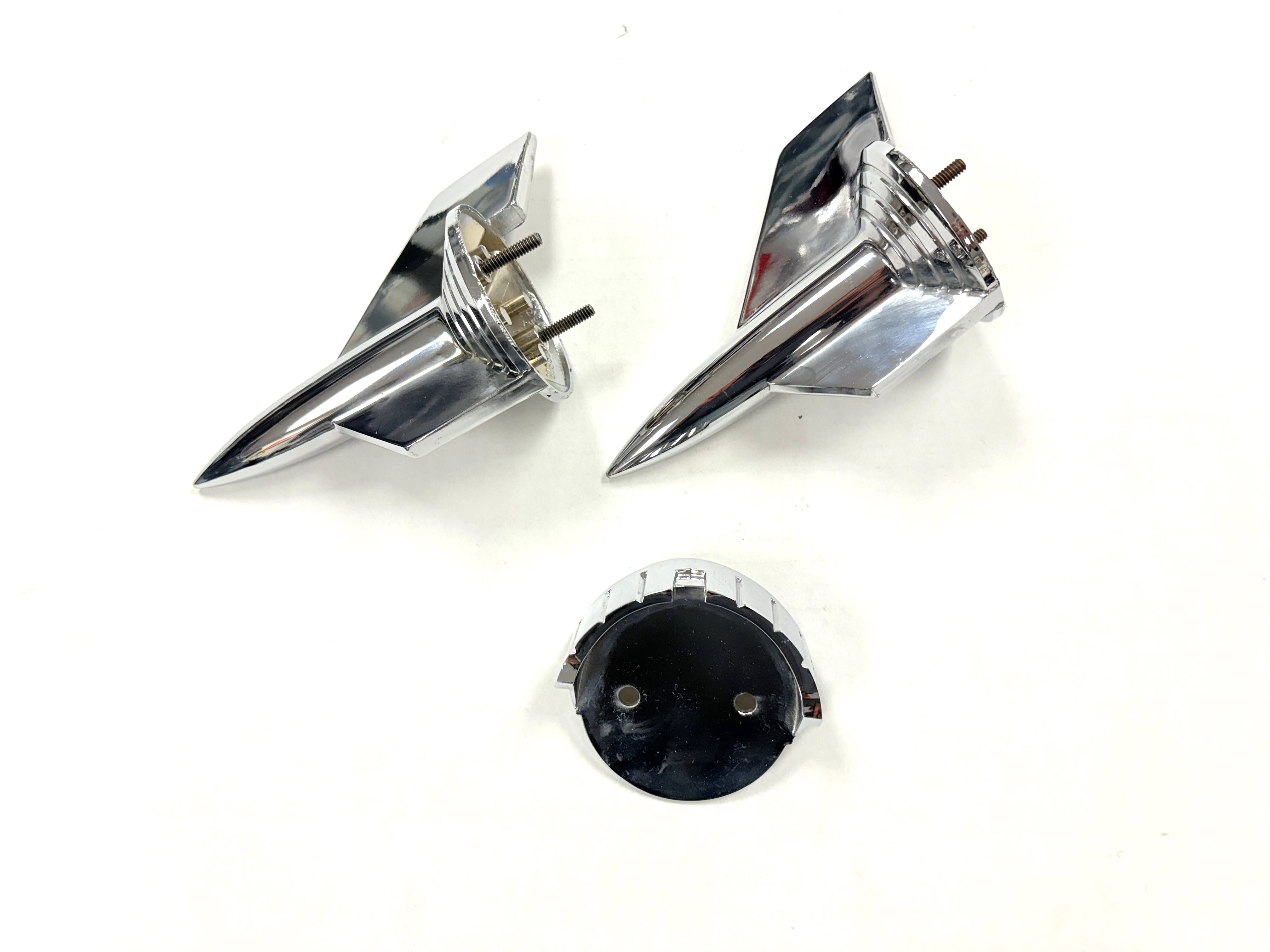 New Old Stock GM 1957 Chevrolet hood rockets. Also 1 left side backing plate. GM #'s 3738985 & 3738983-LH. Sold as a set.