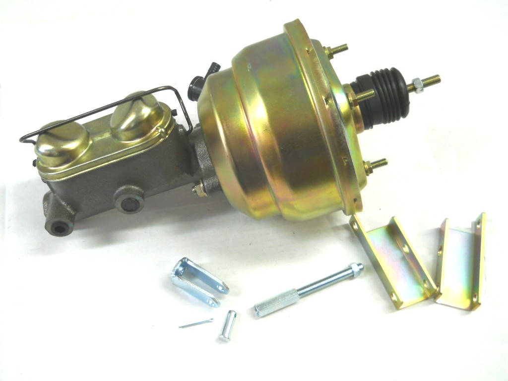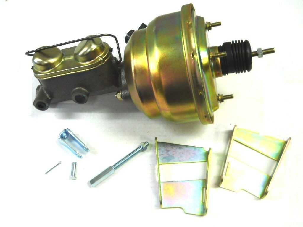 This is a complete front power disc conversion kit for any 1955-57 Chevrolet passenger car. Kit includes: Rotors, bearings, grease seals, dust caps, spindle nut & washers, caliper brackets, new calipers, disc pads, front brake hoses & clips,8" dual diaphragm brake booster, pedal rod, master cylinder, combination valve & bracket and brake light switch pigtail.
