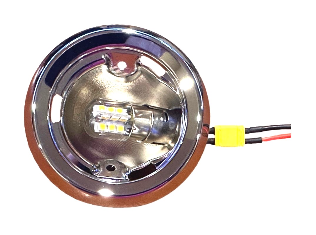 Complete dome light assembly with lens. Fits 1955 Hardtop and 1955-57 Nomad models. Fits left or right side. Made from billet aluminum. Includes LED lamp assembly with pigtail wires. Sold single.