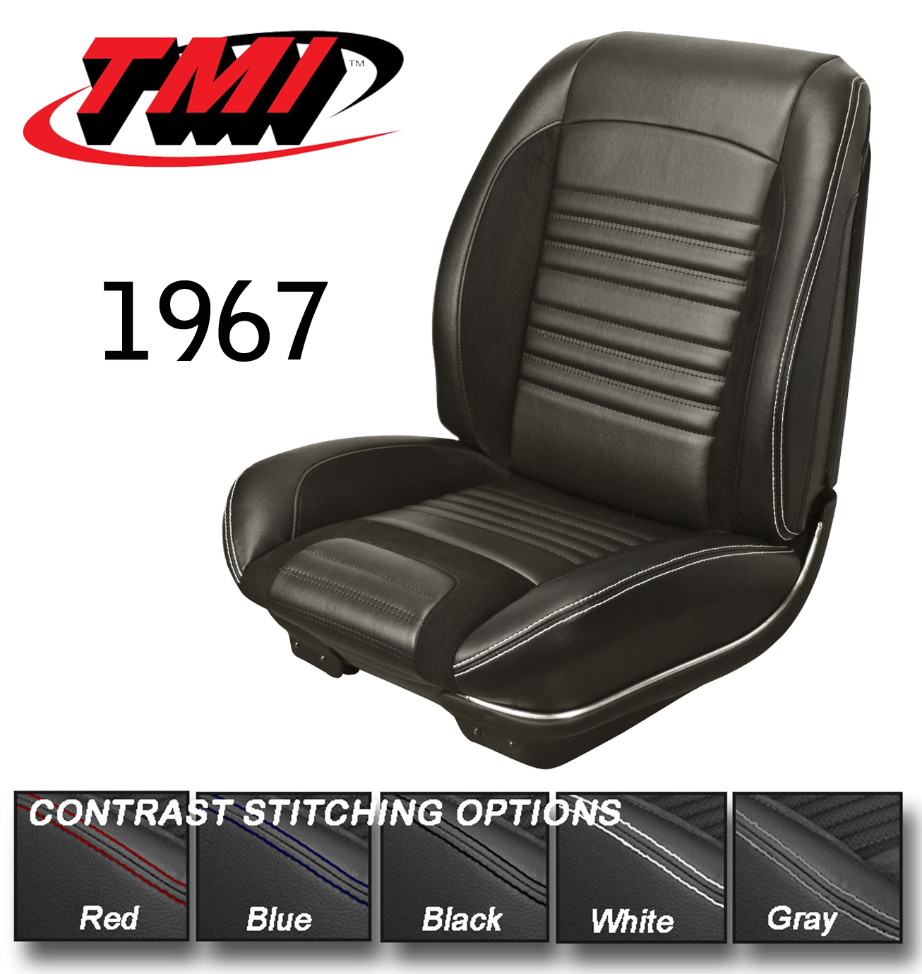 1967 Chevelle All Models SPORT R Seat Upholstery, Black Vinyl, Black Suede, Your choice contrast Stitching, Front Buckets ONLY