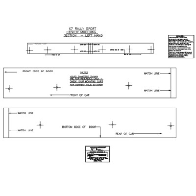 Digitally rendered full size templates to locate holes for mounting 1967 Camaro Rally Sport lower body moldings. Perfect for cars with new sheetmetal or converting to a Rally Sport.