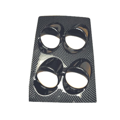 Custom gauge housing to use aftermarket gauges in a stock console. Holes measure 2 1/8" and use a 2 1/16" size gauge. Molded in black Carbon Fiber plastic.