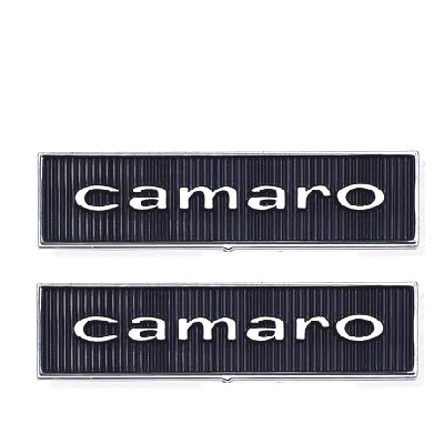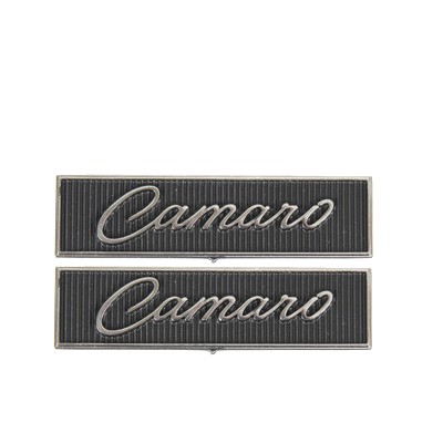 Reproduction door panel emblems for 1967 Camaro's with standard interior. Black background with "Camaro" in block lettering. Sold as a pair.